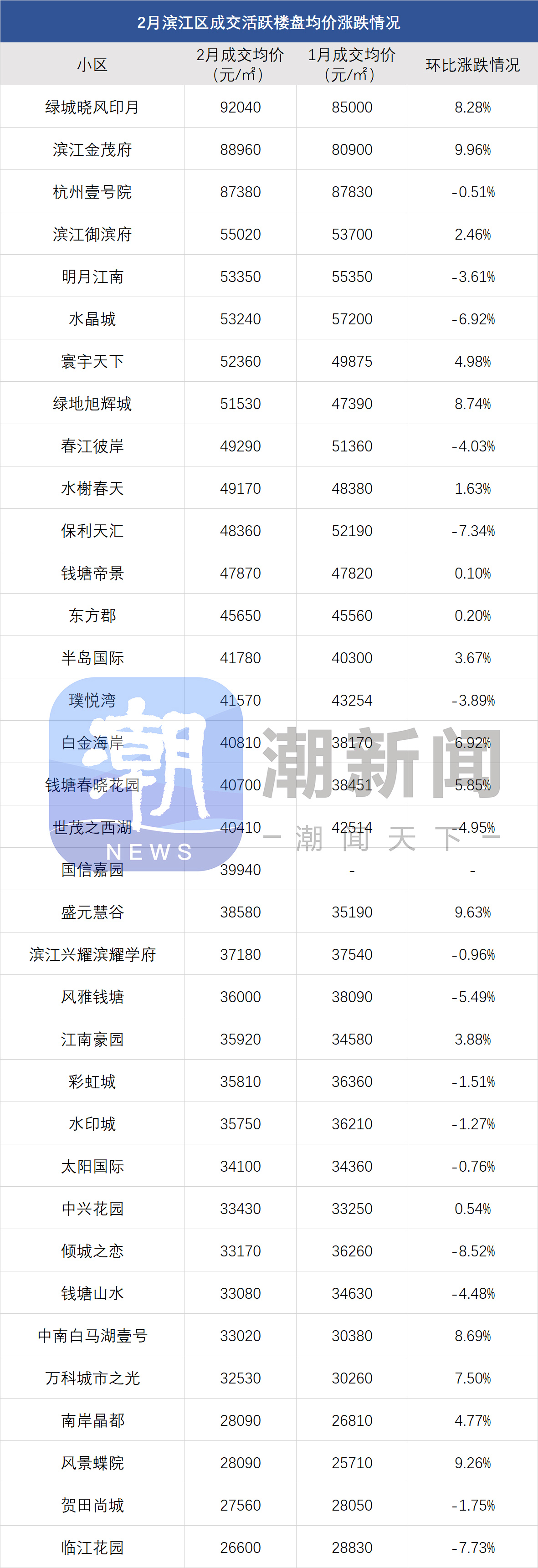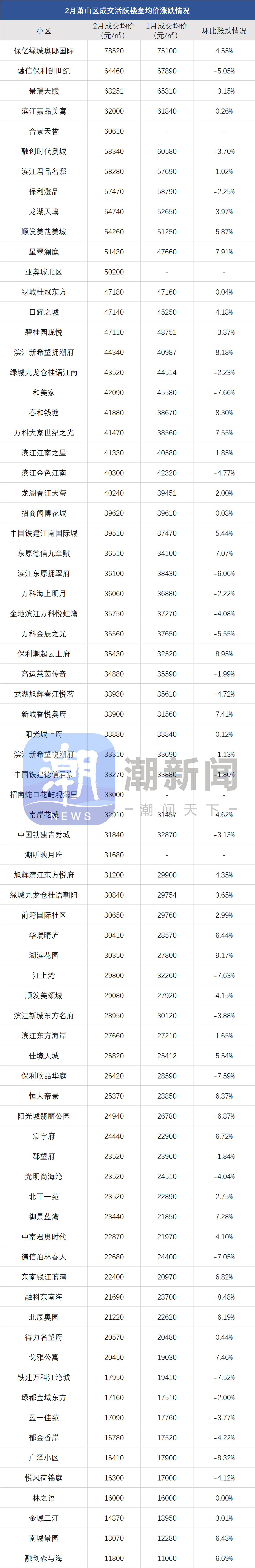 钱江世纪城-亚运村一带房价回涨,还带动南侧萧山市北板块房价,部分次新小区2月份成交价上涨,比如滨江新希望拥潮府,环比涨8.18%;保利潮起云上府,环比涨8.95%。