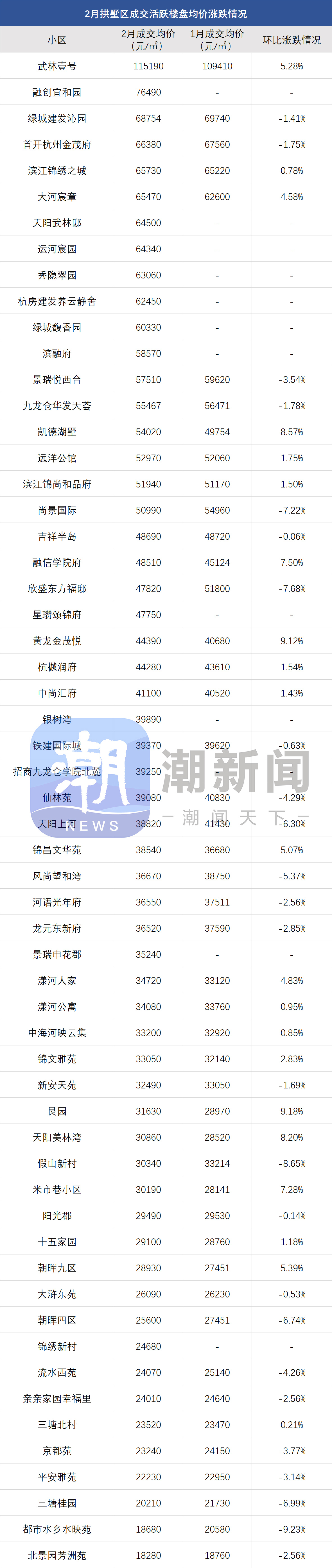 比如上城丁桥板块的武林九里、湾上风华,2月成交均价在26900元/㎡、20870元/㎡,环比跌幅分别为6.27%、9.1%。次新小区芳菲之城,二手房成交均价33400元/㎡,环比微降1.76%。