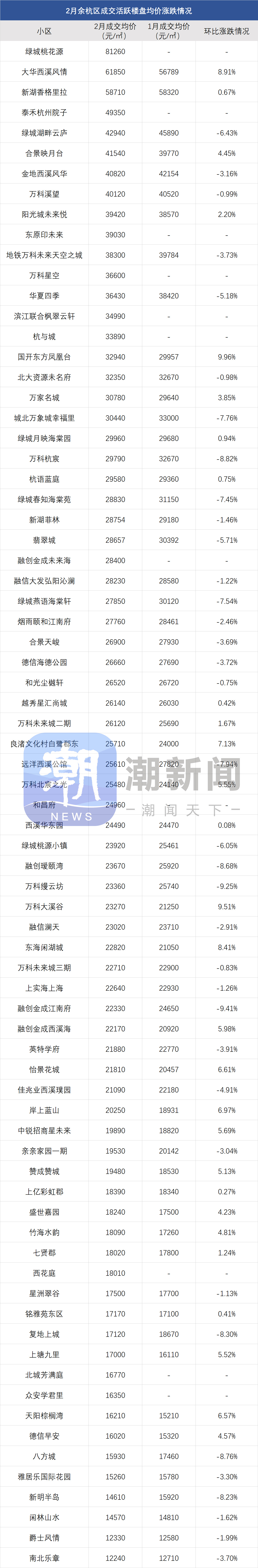 贝壳杭州研究院数据显示,2月二手住宅成交均价2.95万元/㎡,环比降3.4%,主要是刚需板块不少小区二手房价格还在下跌。