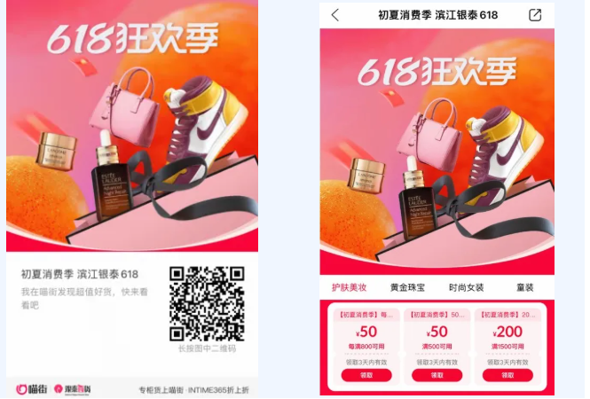 方式1:打开喵街APP,切换商场页“杭州滨江银泰百货”,找到“BINGO·初夏消费季”入口点击进入,立即领取券,具体参与专柜可点击券查看明细。