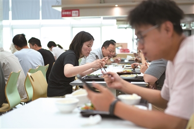 食堂分轻食简餐区、少油少盐区、五谷杂粮区,有近40种菜品,主食也有米饭、煎包、尖椒鸡蛋饼、杂粮小粥等多种选择。6月4日中午,正逢用餐高峰,来吃饭的人从选菜窗口沿着走廊,一直排到了电梯口。