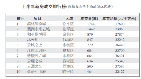 在半年度成交套数前十中,限价项目占据7个。位于东湖新城的滨杭滨纷城以1744套的成交量高居第一,成交均价17600元/平方米,从去年12月首开以来,已经九开九罄,一共成交2268套。