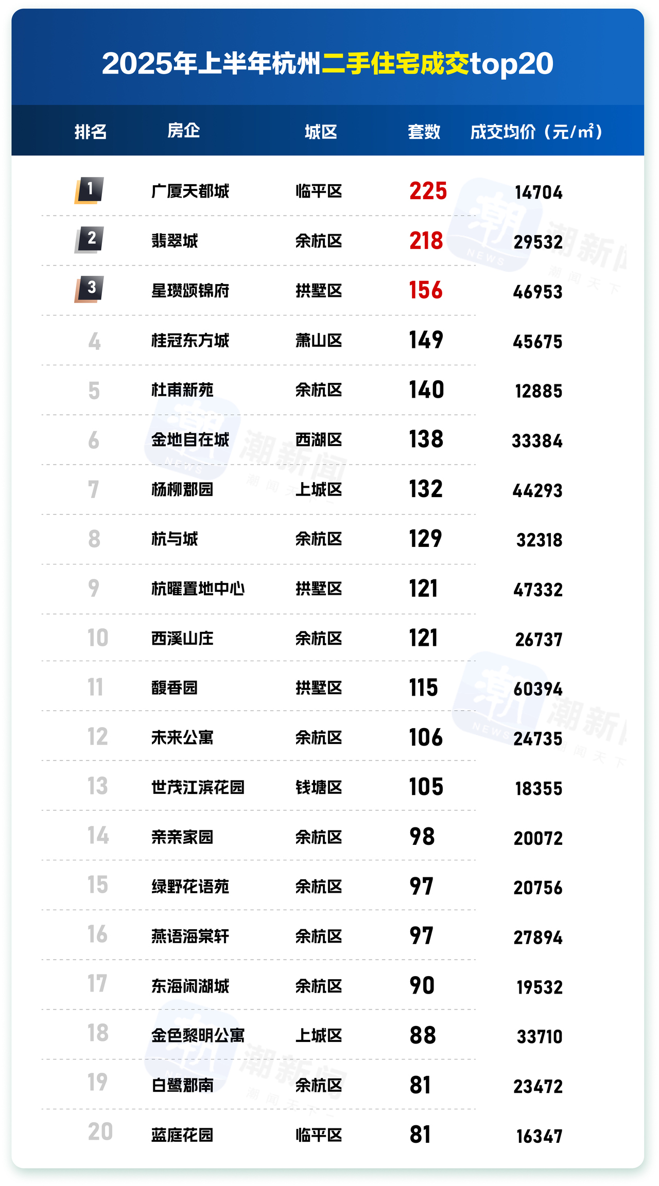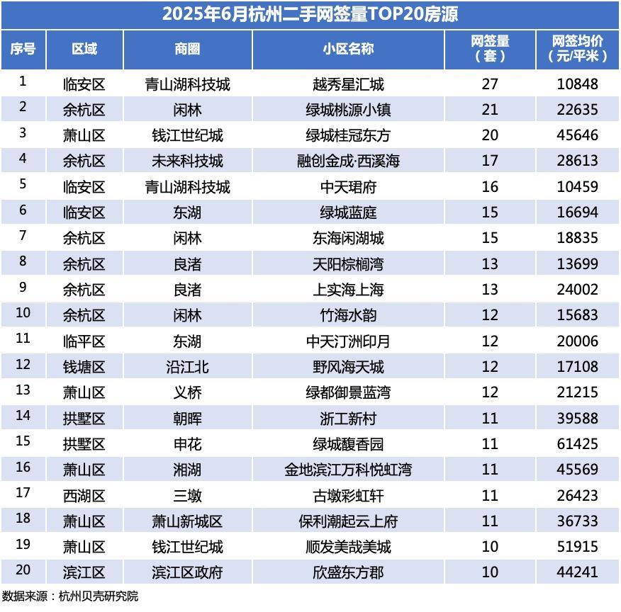 在6月成交前20的榜单中,6个单价仅“1字头”的小区跻身其中。如青山湖的越秀星汇城,6月成交了27套,是杭州第一名,网签均价10848元/㎡;同样是青山湖的中天珺府,6月也成交了16套,均价10459元/㎡。另外像良渚的天阳棕榈湾、闲林的竹海水韵、钱塘区的野风海天城等,都有10余套的成交量。