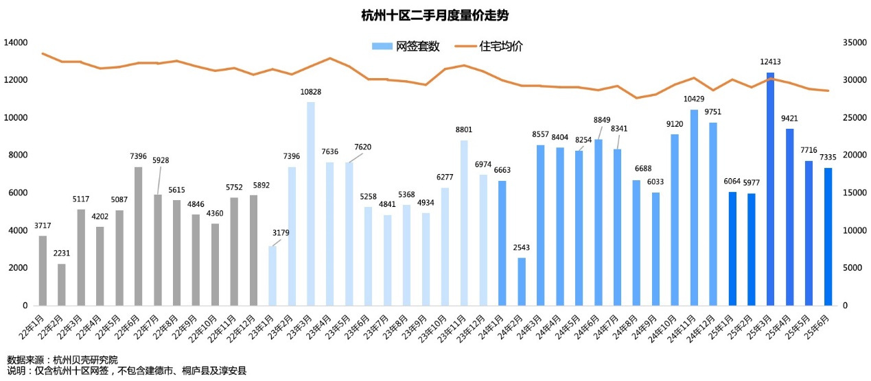 今年上半年,“小阳春”的热度还历历在目。3月杭州市区成交二手房12413套,为8年来月成交量的新高。然而市场热度没能保持,4月起,成交量就出现了下滑。接着二手房月成交量出现三连跌,到6月,成交量降至7335套,环比5月又下滑了4.9%,同比去年的8849套更是减少了17%。