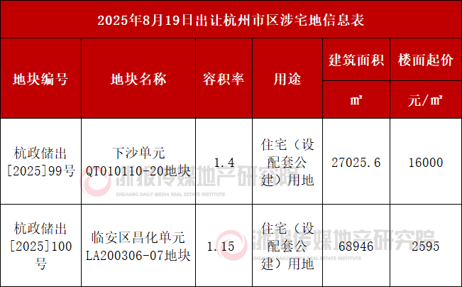 17日,杭州市区两宗涉宅地挂牌,分别位于钱塘区金沙湖、临安区昌化镇,将于8月19日出让。两宗土地容积率均低于1.5,延续宅地低密供应趋势。