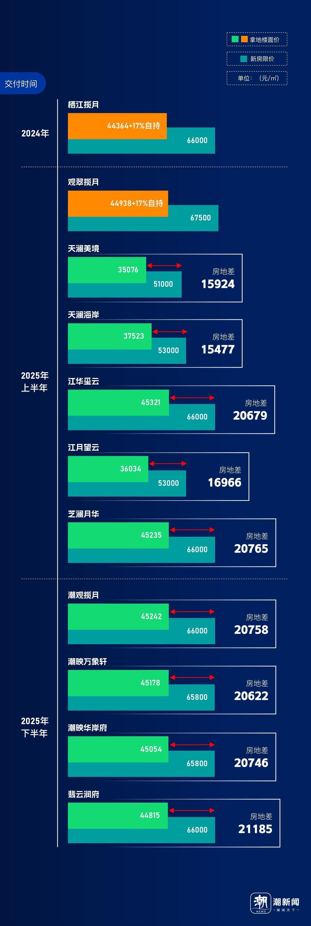 这场交付大考,是房企综合实力及社会责任心的较量。利润空间的大小并不是一个楼盘品质的决定性因素。钱报美好生活研究院整理了钱江新城二期楼盘的房地价差,发现除去有自持和公租房源的观翠揽月、栖江揽月,其余9个今年交付的限价楼盘中,房地价差最大的恰是翡云润府,高达21185元/㎡。房地价差最小的楼盘则是天澜海岸,仅15477元/㎡,而天澜海岸的交付备受好评。