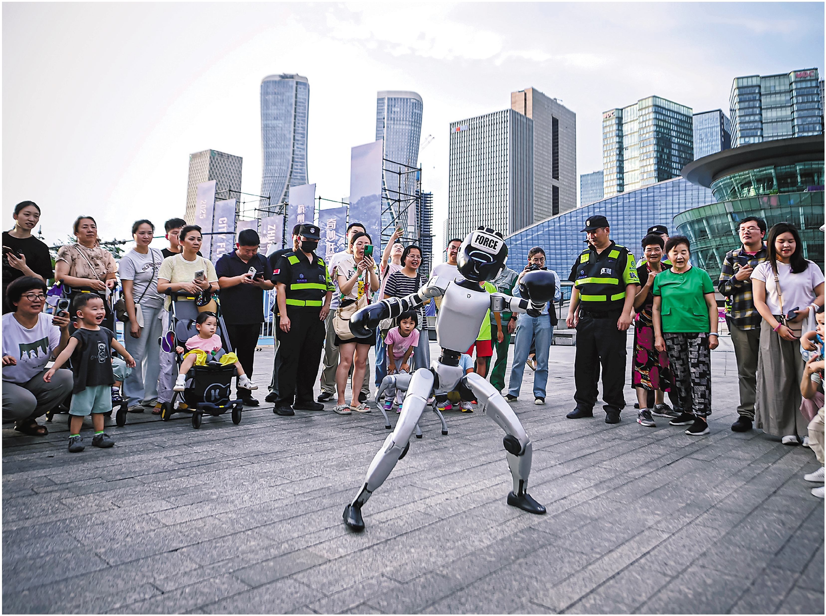 6月27日,2025杭州奇妙夜活动在主会场钱江新城启动。图为市民在主会场观看人形机器人表演。 新华社记者 江汉 摄