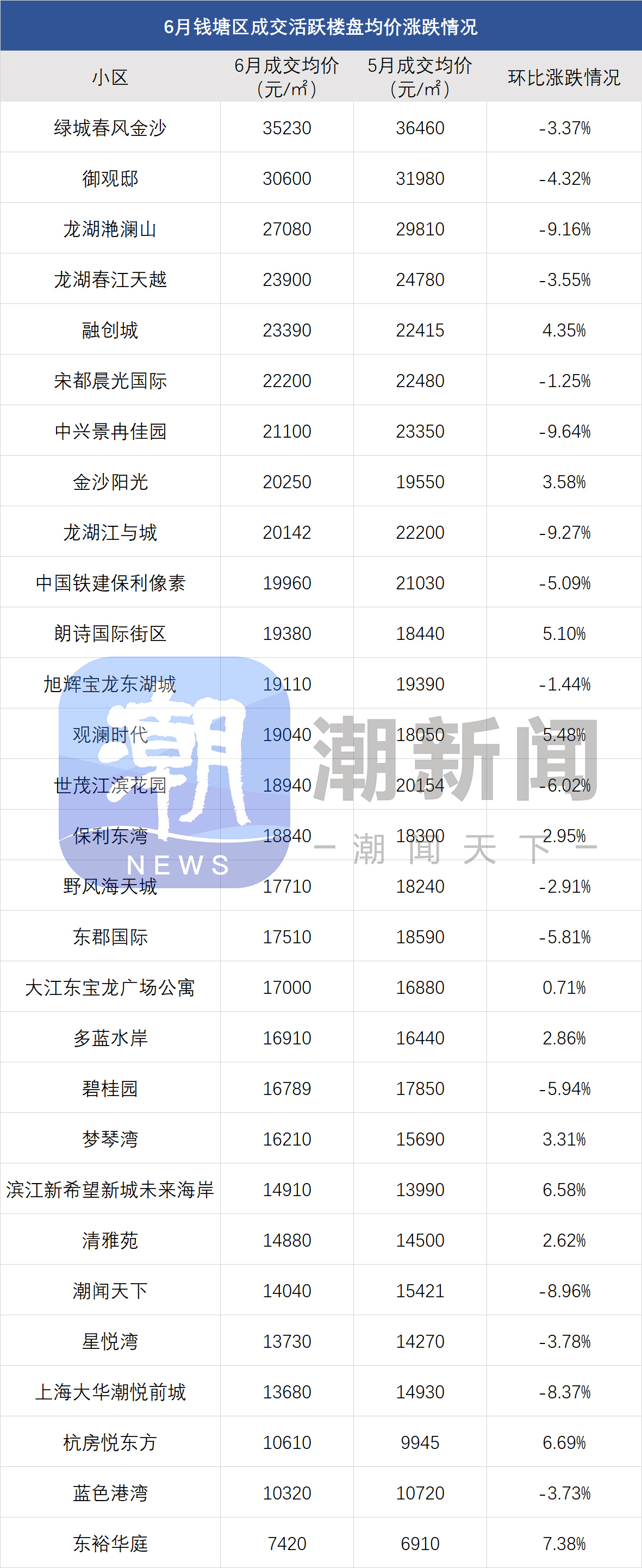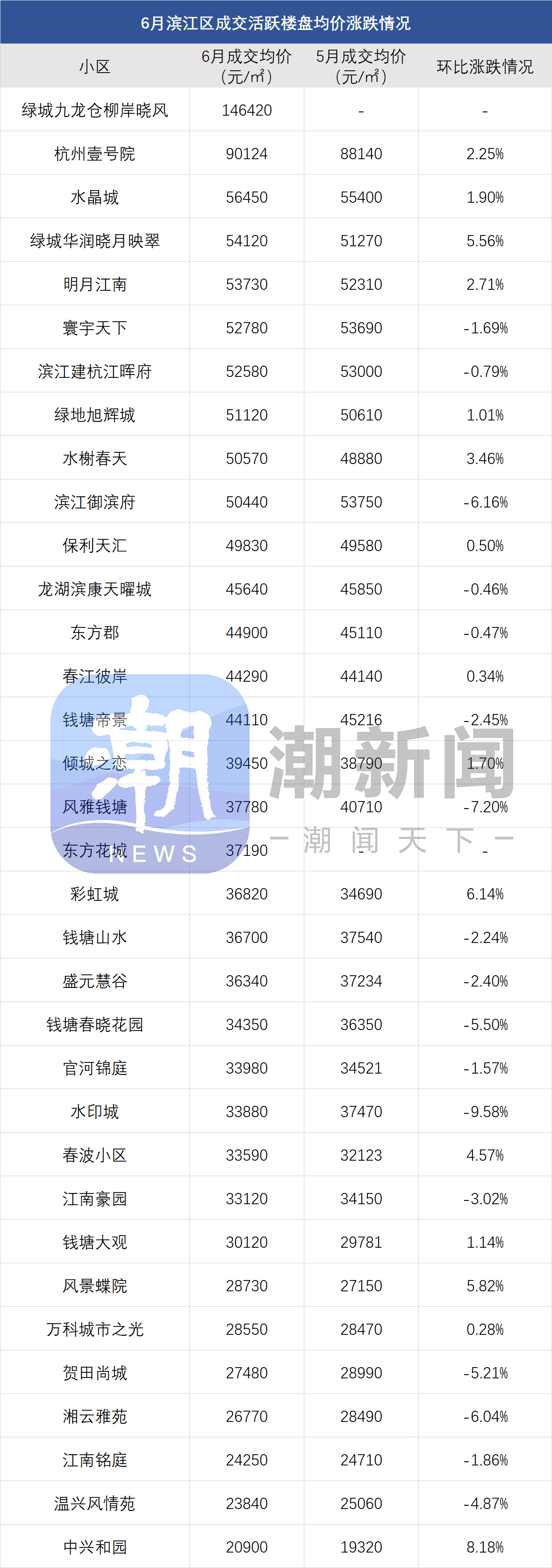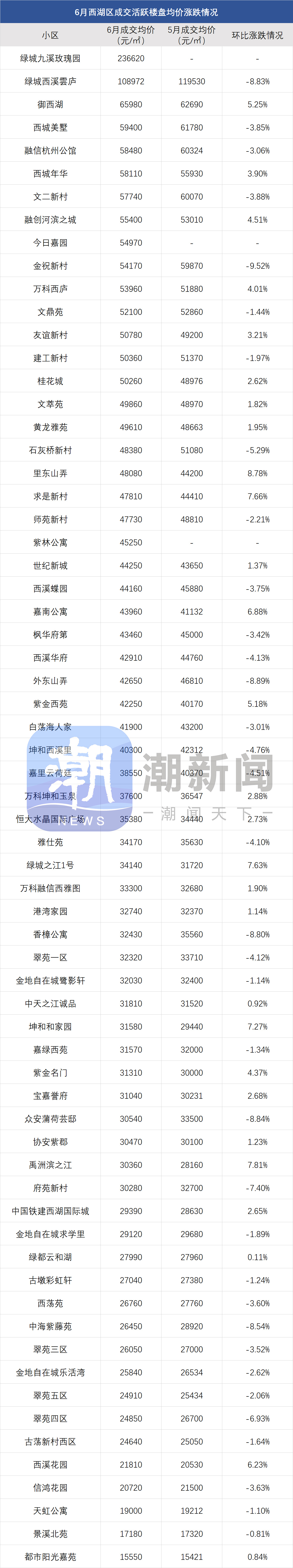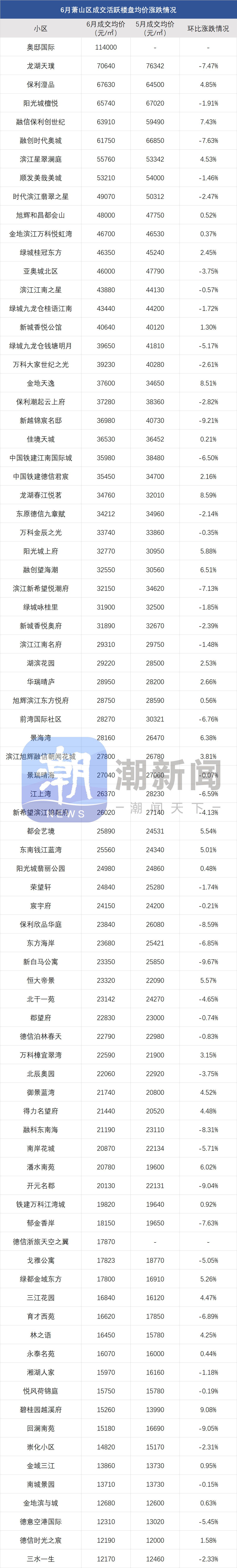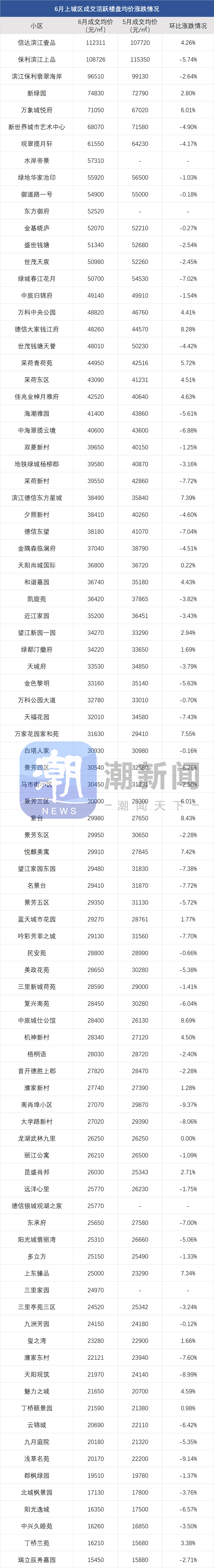 此外,像滨江区的豪宅壹号院、柳岸晓风,次新房晓月映翠,近月以来价格也很稳定。6月壹号院均价比5月涨了2.25%,晓翠映月涨了5.56%。
