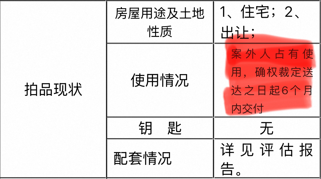 业内人士表示,这很可能跟这套法拍法院目前尚未腾空有关。根据法拍页面的告示,目前这套房源被案外人占有使用,确权裁定送达之日起6个月内交付。这意味着,竞买人拍下这套房子后,实际拿到手可能要半年后。对客户来说,其中涉及半年的房租费用,体现到房价上就会打一定的折扣。