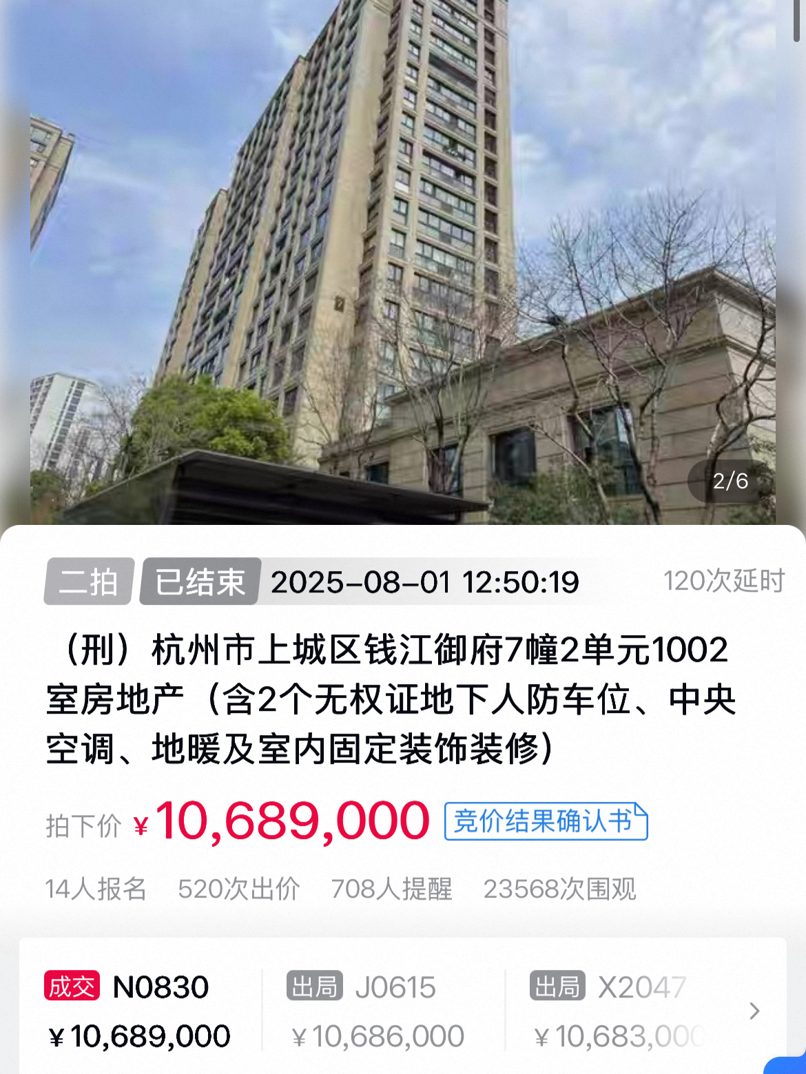 昨天上午,胜利小学新城校区隔壁的钱江御府,有一套建筑面积165.88m²的大户型房源(带两个人防车位)在法拍平台拍卖。这是该房源的第二次拍卖了,这套房子因为涉刑事案件被拍卖,此前第一次拍卖时起拍价1031万元,虽有1人报名,但因为无人出价而流拍。此次二拍,起拍价下调至825万元,折合起拍单价约4.97万元,这样的价格无疑具有极大的竞争力,因此吸引了2.3万人次围观,14人报名,经过520轮漫长的拉锯战,才在中午12:50分左右决出胜负,最终成交价定格在1068.9万元,折合成交单价约6.44万元。