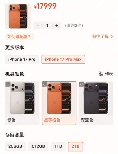 iPhone 17 Pro Max新增2TB 存储容量,售价高达17999元