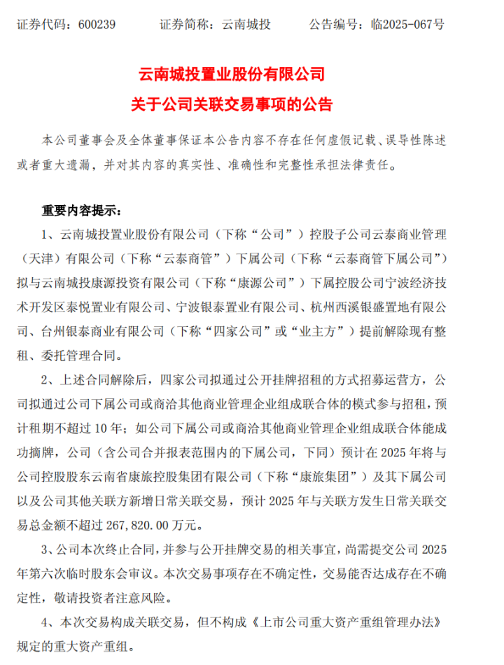 9月10日,云南城投置业股份有限公司发布公告,其子公司云泰商管拟与云南城投康源投资有限公司下属控股公司宁波经济技术开发区泰悦置业有限公司、宁波银泰置业有限公司、杭州西溪银盛置地有限公司、台州银泰商业有限公司提前解除现有整租、委托管理合同。