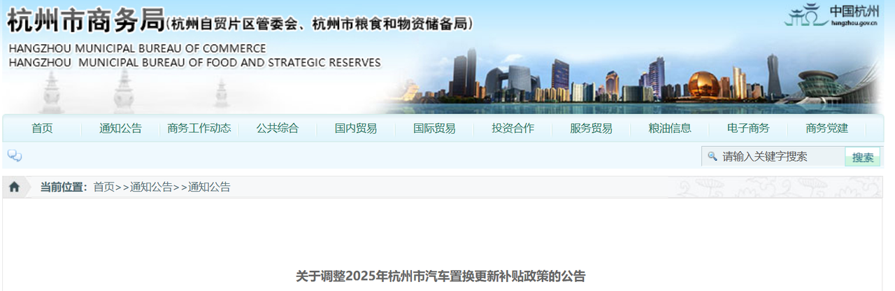 9月12日,杭州市商务局网站发布《关于调整2025年杭州市汽车置换更新补贴政策的公告》。
