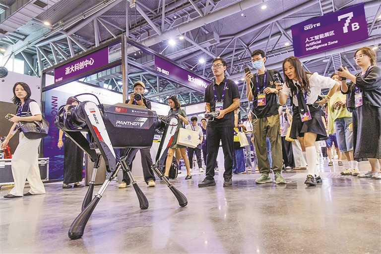 全球跑得最快的机器狗黑豹2.2来到数贸会。