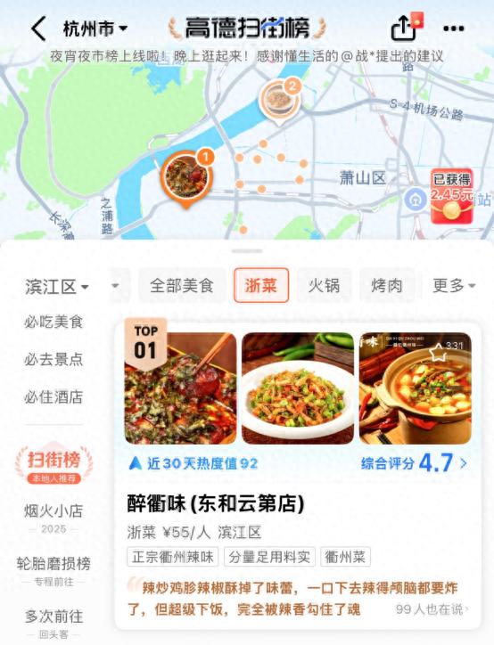 在杭州滨江区一个略偏僻的街边,醉衢味饭店最近格外热闹。原本只靠老客撑起生意的小馆子,因为意外登上高德“扫街榜”——滨江区浙菜榜第一名,忽然成了街坊口中的“宝藏店”。
