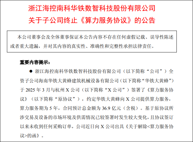 导火索源于9月30日晚的一份公告,海南华铁称,全资子公司与杭州X公司签署的36.9亿元算力服务协议正式终止。