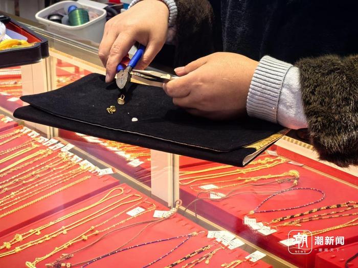 在杭州白马珠宝市场,虽然当天市场基础金价显示为1079元/克,但几家主营黄金饰品的商户生意火爆,不少柜台前围着几拨来以旧换新黄金饰品的顾客。