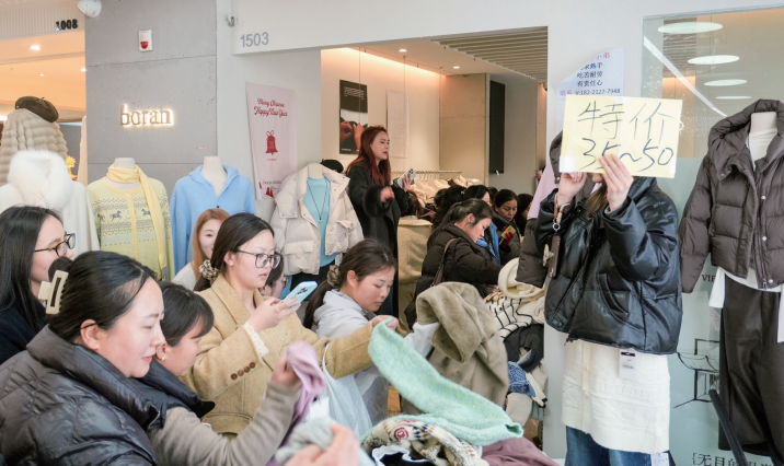 眼下,又到了杭州四季青服装市场的冬装清仓促销季。短款羽绒服价格区间在100—299元,长款羽绒服300元起。图为昨天市民在意法服饰城选购,尤其是特价区,促销氛围更加浓厚,挤满了“扫货”的顾客。