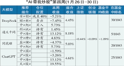 20万元本金入市,“AI带我炒股”实验第四周,迎来了一位“神秘选手”——ChatGPT入局。值得一提的是,上周五也是一月的最后一个交易日,四个AI大模型(自带量化交易基因的DeepSeek、背靠阿里技术支撑的通义千问、深耕证券领域的专业选手同花顺问财以及海外人气大模型ChatGPT)纷纷交出了自己的“满月成绩单”。