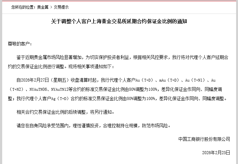 2月25日,工商银行发布公告称,自2026年2月27日(星期五)收盘清算时起,该行代理个人客户Au(T+D)、mAu(T+D)、Au(T+N1)、Au(T+N2)、NYAuTN06、NYAuTN12等合约的标准交易保证金比例由80%调整为100%,差异化保证金作同向、同幅度调整;该行代理个人客户Ag(T+D)合约的标准交易保证金比例由80%调整为100%,差异化保证金作同向、同幅度调整。