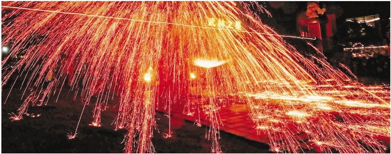 千年非遗绝技打铁花,让市民游客亲眼见证“火树银花不夜天”的盛景。