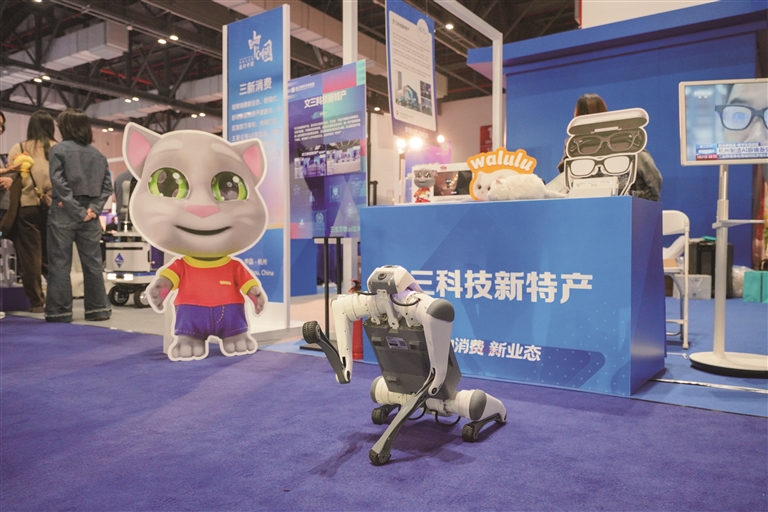 三新消费区块的科技亮点远不止于此。来自朗域数智集团的智慧交通服务机器人同样吸睛。据朗域数智集团海外商务经理程杰介绍,这款机器人目前主要应用于机场场景,通过人脸识别、AI交互和大数据分析,让旅客的出行更加便捷高效。“与常见的消费类机器人不同,我们更侧重于‘硬核实用’。”程杰表示,该产品搭载了高精度导航系统和多语种交互模块,不仅在国内机场落地,更成功应用于卡塔尔的哈马德国际机场,成为“中国智造”出海的一张新名片。