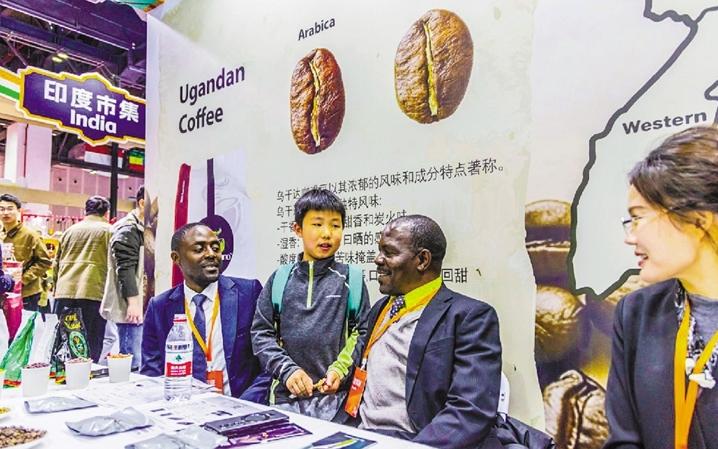 来自乌干达的展商向围拢过来的中国消费者热情介绍本国的咖啡豆。