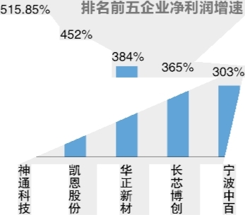 2025年净利润增长率排名第二和第三的分别是来自丽水的造纸企业凯恩股份以及来自杭州的电子元器件企业华正新材,两者2025年净利润增速分别达到452%和384%。
