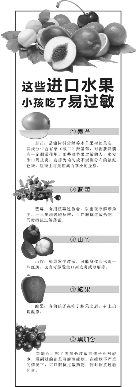 两颗小小的蓝莓,让11岁的小男孩身上发出荨麻疹;一个甜甜的泰国小芒果,让13岁的小女孩嘴巴周围发出皮炎。最近,杭州市中医院皮肤科医生们发现,进口水果导致过敏的案例越来越多。