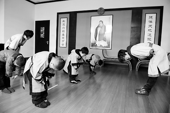 在诸修书院,一个孩子的一天是这样的:早上6点起床,洗漱完毕,给孔子行三拜礼。然后早读,读的是中文经典,例如《孟子》、《论语》等等。