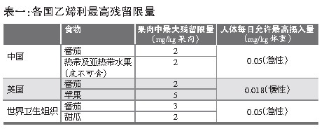 美国环境署规定,苹果果肉乙烯利最大残留量为5mg/kg,番茄2mg/kg。世卫组织规定,番茄果肉乙烯利最大残留量为3mg/kg,甜瓜2mg/kg(见表一)。