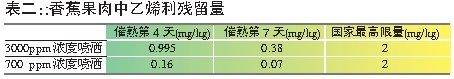 其间,应教授分别测了放置第4天和第7天香蕉果肉中的乙烯利残留量,结果也全部低于国家规定的最高限量标准(见表二)。