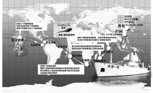 离开祖国航行369天,大洋一号驶过了除北冰洋以外的世界三大洋,行程64162海里,约合11.88万公里,接近地球赤道长度的3倍。