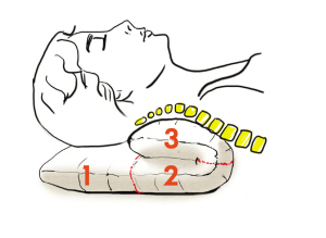 范院长说,把枕头分成三等分,把一边的1/3往中间折,这样枕头变成一侧2/3厚,一侧1/3厚,睡在枕头上的时候要注意,比较厚的这侧垫在脖子正下方,薄的这侧垫在后脑勺下。这样,头有点后仰,脖子凭枕头的厚度塑造成一个向上的曲度。