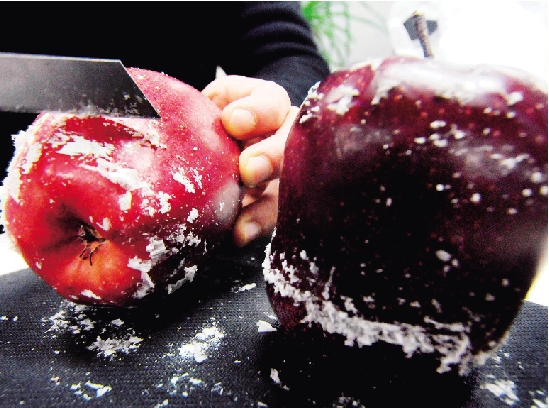 小刀在苹果表面轻轻一刮,一层层的蜡就掉了下来。 尹炳炎 摄
