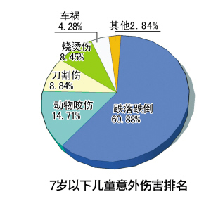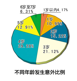从年龄看,最易发生意外的是4岁年龄组,占29.28%。具体为:1岁以内占4.17%;1岁占10.99%;2岁占15.22%;3岁占21.12%;4岁占29.28%,5岁占12.91%;6岁至7岁占6.31%。