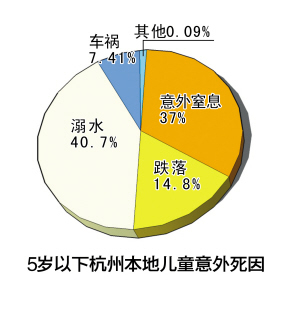 2011年1月至6月,杭州户籍儿童,意外伤害占死因的21.77%。死因排名依次是:溺水40.7%、意外窒息37%、跌落14.8%和交通意外7.41%。流动人口儿童中,意外伤害占死因的25%。排名依次是:意外窒息51.9%、溺水22.2%、交通意外22.2%和跌落3.7%。