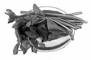 菜场里买回家的南瓜藤,有粗藤,有细蔓,稍稍老一些的话,还有一层扎人的毛刺刺。做菜前,要先把老藤掐掉,再跟剥蚕丝似的,把藤的表皮仔仔细细剥掉,只留下褪掉筋络的梗芯,碧绿湿润,才是最柔嫩可口的。