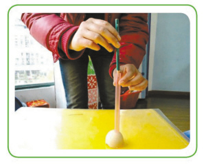 步骤一:鸡蛋壳凸面朝上,用铅笔笔尖模拟小鸡的尖嘴巴,把“尖嘴巴”放在吸管的顶端后再放手,发现蛋壳容易碎。