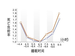 节假日睡个懒觉是件很惬意的事情,不少年轻人甚至可以一觉睡到大中午。这几天,微博上一张“睡眠时间”对阵“死亡危险率”的图表(以下简称“图表”)却给爱睡懒觉的人泼了一盆冷水,这个微博说,睡太多可是会短命的。图表显示(如图),睡6.5小时的人死亡率最低,少于4.4小时或高于9.5小时,死亡危险率会翻倍增高。