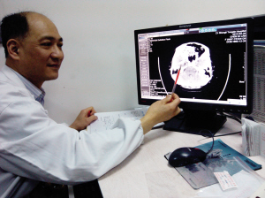 省立同德医院神经外科金心主任仔细地看了CT片,右侧颞叶处的确有阴影,但不能判断里面是什么异物。