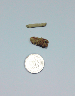 这就是“闯祸”的木屑、一元硬币、包裹着木屑的组织