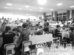 昨晚杭州市退休干部大学的阶梯教室里,等着今天一早报名的人。 记者 董吕平 摄