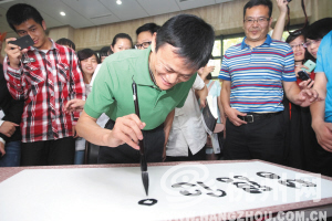 马云现场秀书法,“智信仁勇严”赠母校。 记者 陈中秋 摄