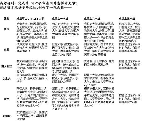 如果学生高考成绩差一点,达到高考二本分数线以上,可以尝试申请新加坡五所理工学院,通过学院测试后可以入读。如果学生高考成绩不理想,可以凭借高中成绩申请新加坡的私立大学。