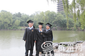 三位浙江籍北大学子在北大校园毕业留影,从左边起分别是魏晔翔、曾齐齐、李宇航。 记者 胡信昌摄