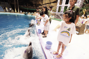 10名“小小饲养员”在训练师的指导下,给海豚喂食,并指挥海豚做各种动作。小朋友们学得很快,用右手划圈,海豚便在水中旋转身体;两掌向上抬起,海豚伸出头来“直立”;双手像音乐指挥家一样挥舞,海豚就咕咕呱呱地“唱”起歌来。