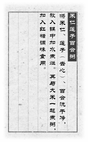 做法:很简单,把米仁、莲子(去心)、百合洗干净,放入锅中加水煮烂。再与大米一起煮粥,加入红糖调味食用。一天里当点心或者正餐吃,都可以。