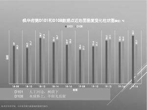 40多名少科院小院士,分成4组,8月9日上午11:10-11:30时段,他们对这两个小区进行了温度测量,发现翠苑一区的室外温度在35-35.8℃,而枫华府第的室外温度在39.1-40.2℃之间。