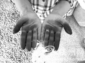 手变黑后不痛也不痒,但要恢复原样,短则十几天、长则一个月。也许有人会说:“戴双手套不就好了吗?”其实,村民们早就试过,普通棉纱手套不管用,液体依旧能渗进去;塑胶手套确实有防护效果,但是不透气,一天捡下来,闷得难受,所以用的人不多。